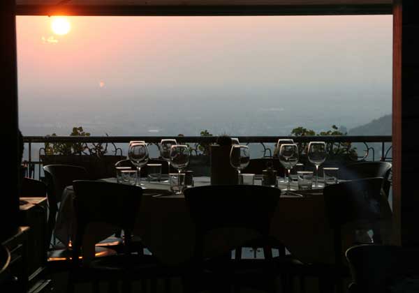 - ベルガモのアルタ地区。夕景を望みながら客待ちのレストラン。